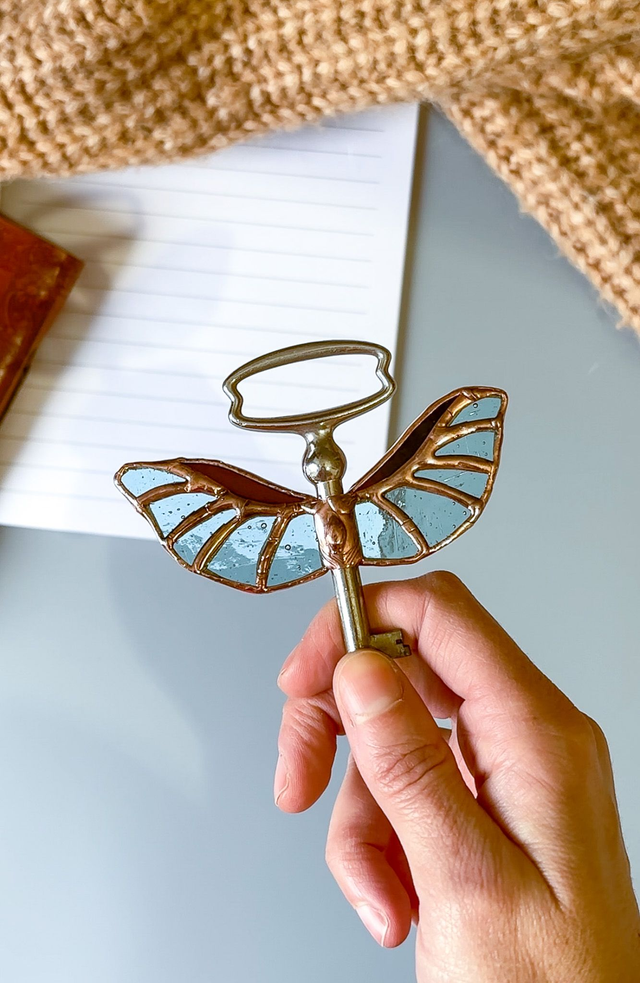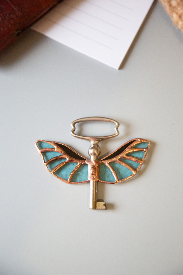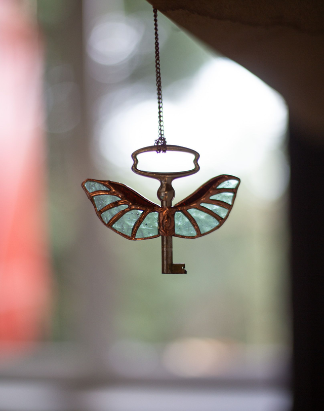 - Matériaux : verres teintés, cuivre, soudure étain, ancienne clé