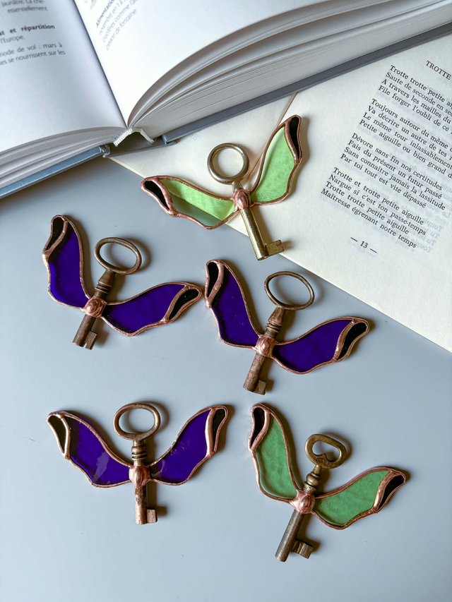 Chaque pièce est unique : le verre est soigneusement découpé, serti de cuivre et soudé à l’étain, selon la tradition artisanale du vitrail Tiffany. Des irrégularités peuvent apparaitre dans les verres.