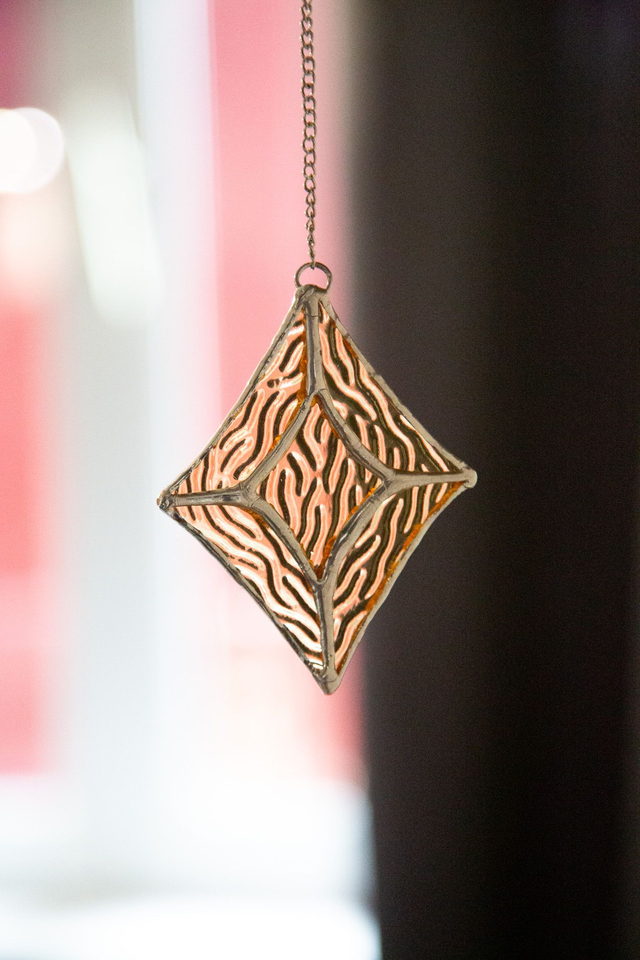 Chaque pièce est unique : le verre est soigneusement découpé, serti de cuivre et soudé à l’étain, selon la tradition artisanale du vitrail Tiffany. Des irrégularités peuvent apparaitre dans les verres.